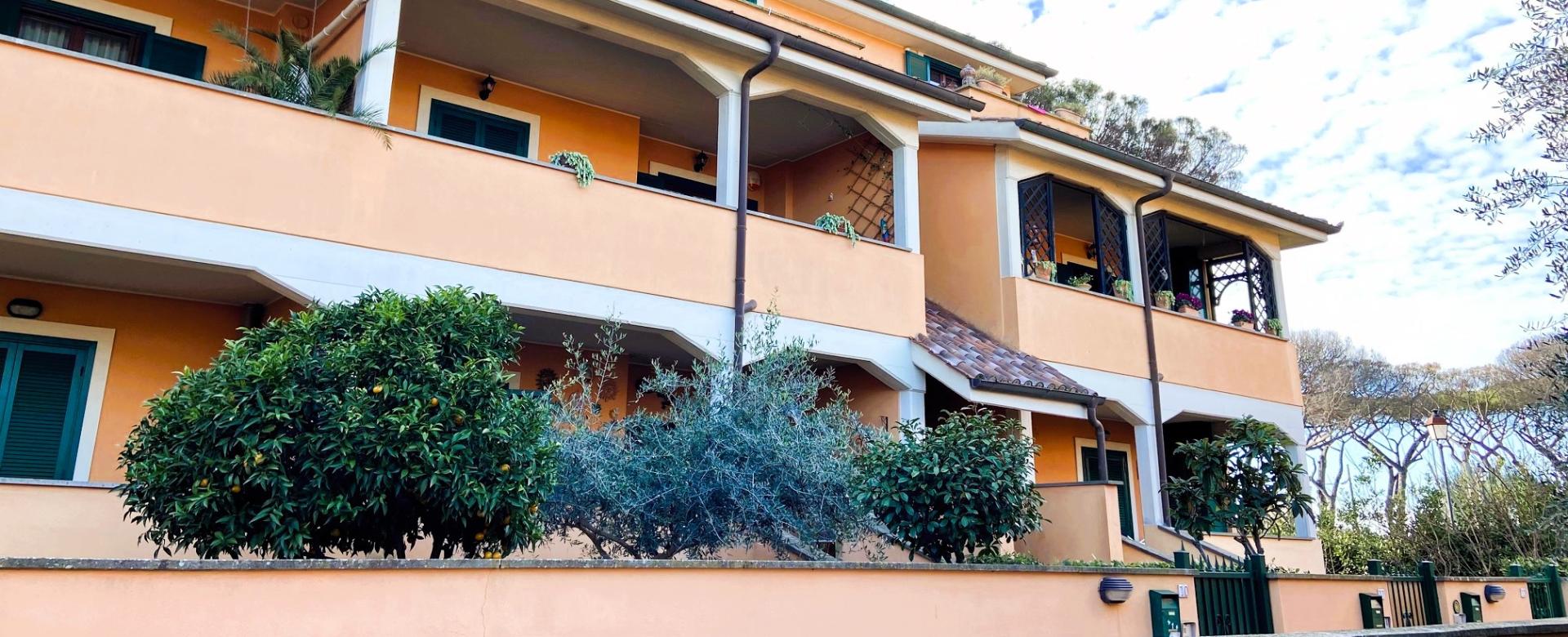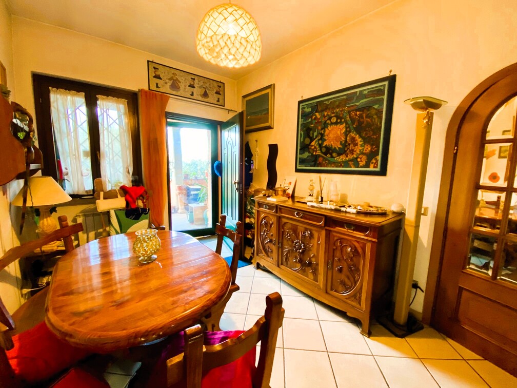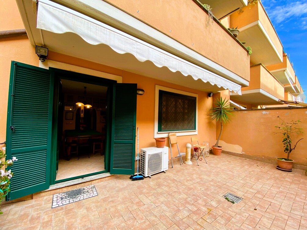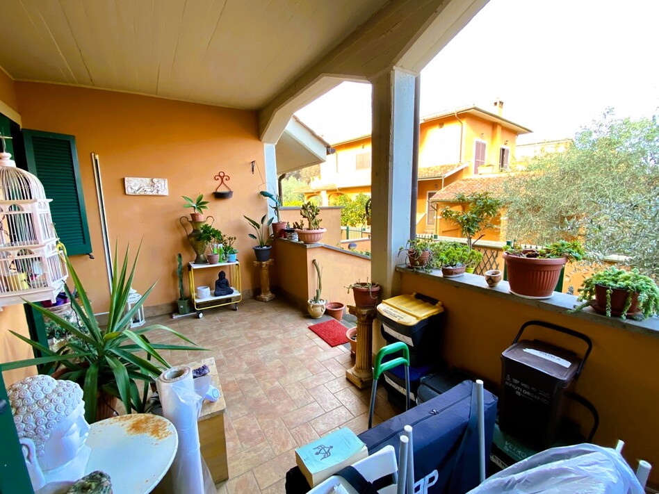All'ingresso dell'immobile si trova un piccolo giardino ben curato, con una bella pianta di ulivo; al piano rialzato un comodo patio coperto di oltre 20 mq conduce all'ingresso che comprende il soggiorno, cucinotto separato, disimpegno, 2 comode camere da letto, bagno con vasca idromassaggio e balcone con affaccio su un antico casale.